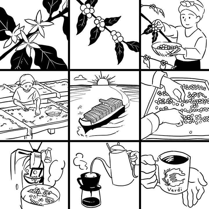 前面に一杯のコーヒーができるまでを9コマのイラストで表現しています。